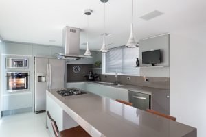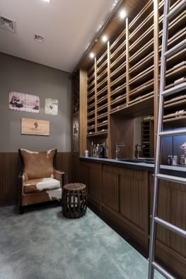 Pensando em soluções funcionais, a marcenaria sob medida, da Campesatto Farina, foi escolhida, com acabamentos diferenciados em cada ambiente. “Os materiais de extrema qualidade utilizados pela empresa no mobiliário exclusivo foram essenciais para o excelente resultado do projeto”, considera o arquiteto.