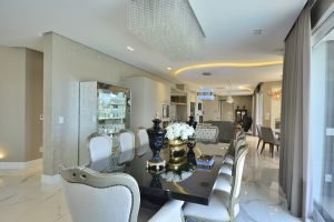 Todas as pedras do projeto foram fornecidas pela CJ Mármores. Na área íntima, organizada no segundo pavimento, as suítes do casal e da filha seguem com o estilo luxuoso dos demais ambientes, atentando também para o gosto pessoal de cada usuário. Para criar espaços requintados e, ao mesmo tempo, acolhedores, as profissionais apostaram em cores neutras e revestimentos com padronagens e texturas delicadas. Detalhes em dourado, iluminação especial e o uso intenso de espelhos conferem imponência, amplitude e sofisticação para as áreas de descanso.