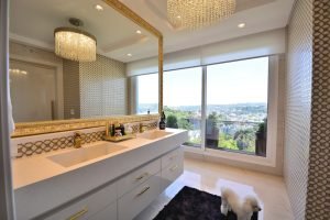 Na definição dos materiais utilizados, Eliane ressalta que tudo foi selecionado com o intuito de valorizar o conceito elegante da residência. Na fachada principal, o visual impressiona com a utilização de uma moldura facetada com revestimento em mármore branco. Para o piso interno, o porcelanato que remete à beleza das pedras, em tons estonados e escuros, contrasta com o requinte do mármore branco. Pisos aquecidos e vidros duplos foram escolhidos para garantir conforto térmico e isolamento acústico em todo o interior da residência.